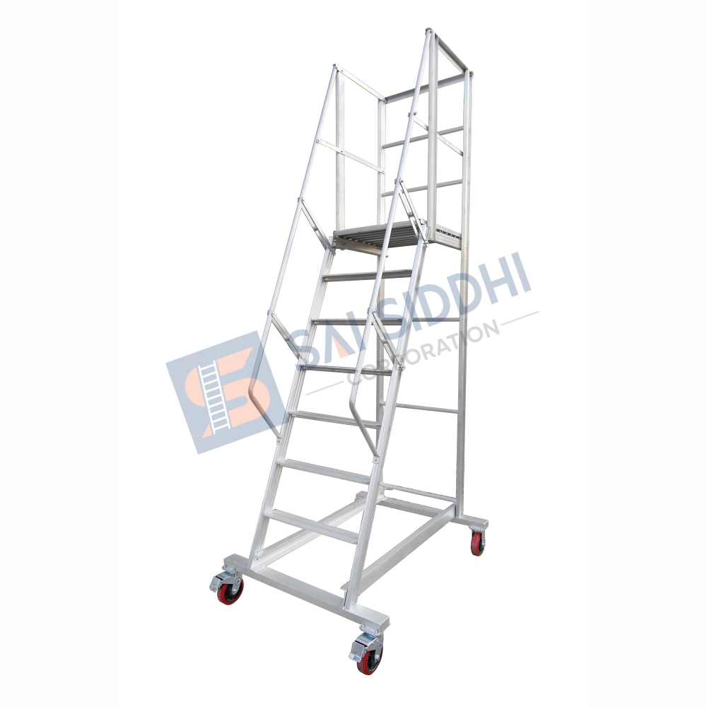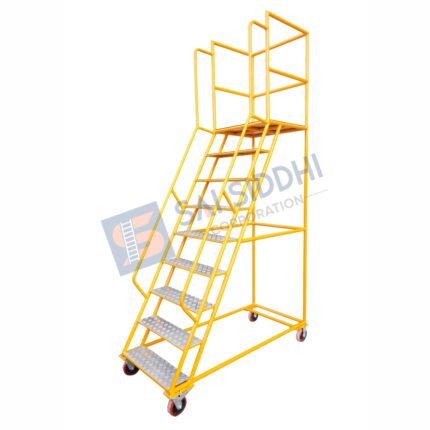 Aluminium Ladder Step Trolley are used for the Industrial purpose. Aluminium Ladder Step Trolley are manufactured from C Channel & Aluminium Flat Steps 112 mm broad. We used Aluminium Section 66 mm x 31 mm x 3.2 mm (min), Flat Steps 112 mm for climbing & Flutted Round tubes 25 mm for opposite side support. We also provide safety Standing Platform on top. These ladders are available up to 15 to 17 ft maximum. These ladders are used in various types of sectors like pharmaceuticals, Chemicals, Automobiles & Technology Sectors.